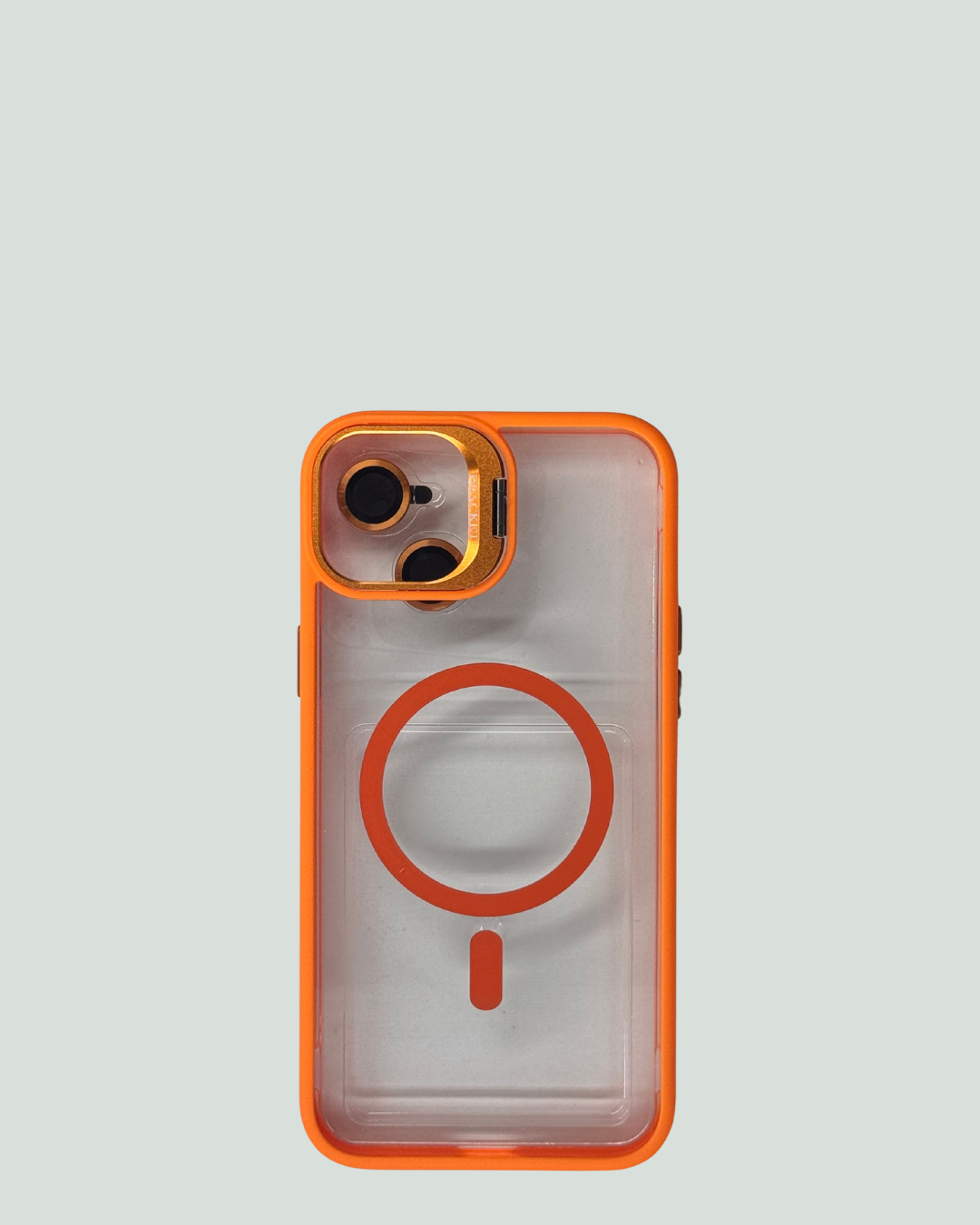 Detta snygga och funktionella mobilskal kombinerar stil och skydd i ett. Skalet har en orange ram och transparent baksida med inbyggd MagSafe-kompatibilitet, vilket gör det enkelt att använda med MagSafe-laddare och tillbehör.