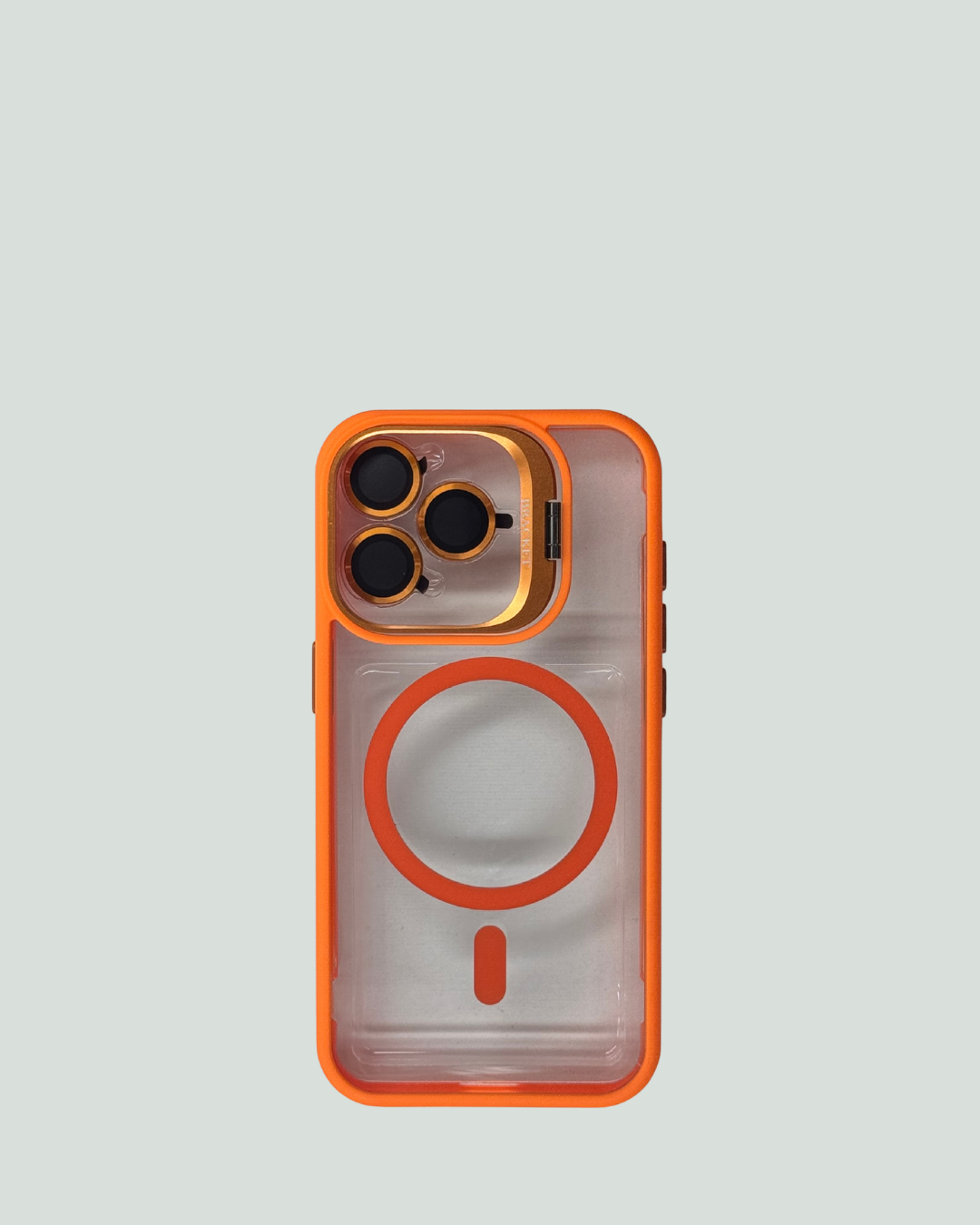 Detta snygga och funktionella mobilskal kombinerar stil och skydd i ett. Skalet har en orange ram och transparent baksida med inbyggd MagSafe-kompatibilitet, vilket gör det enkelt att använda med MagSafe-laddare och tillbehör.